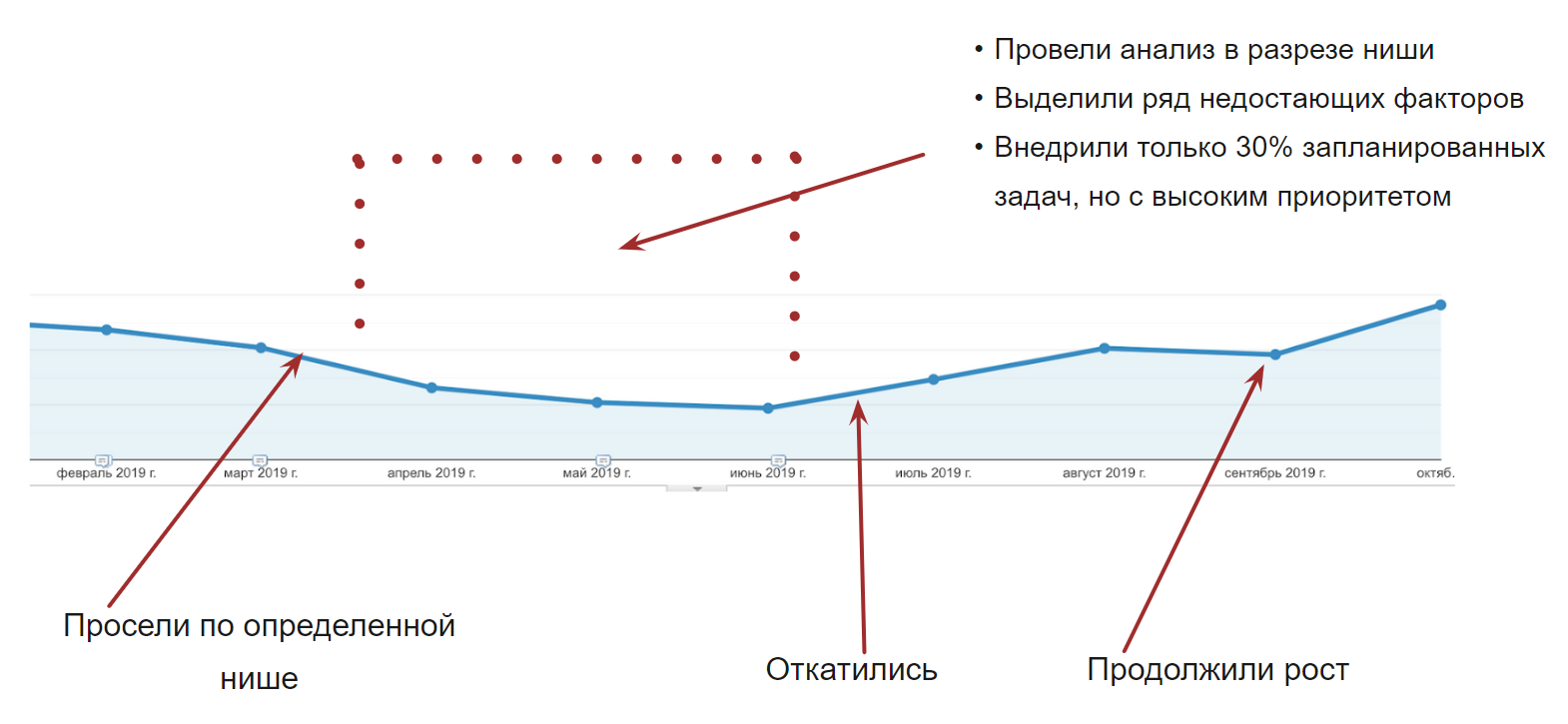 Мы поняли, что в целом по домену и тематике все хорошо, а одна ниша значительно просела. Соответственно, копать нужно там. Мы уделили внимание конкретно этой нише, а не тематике финансов вцелом.
