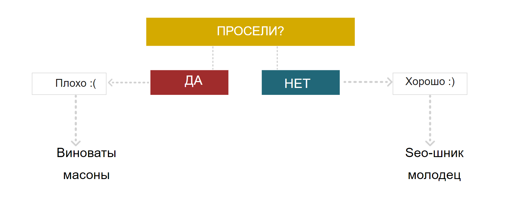 Часто я наблюдаю картину, когда анализ проходит на уровне: мы выросли – это хорошо, пьем шампанское. Либо все просело, все плохо, на вас давит начальник, вы бегаете в панике, находите виноватых, производите какие-то хаотичные действия. Это не совсем корректно и не приводит к результату. Часто люди не проводят анализ, после того, как они выросли. А это очень важный вариант работы SEO-специалиста.