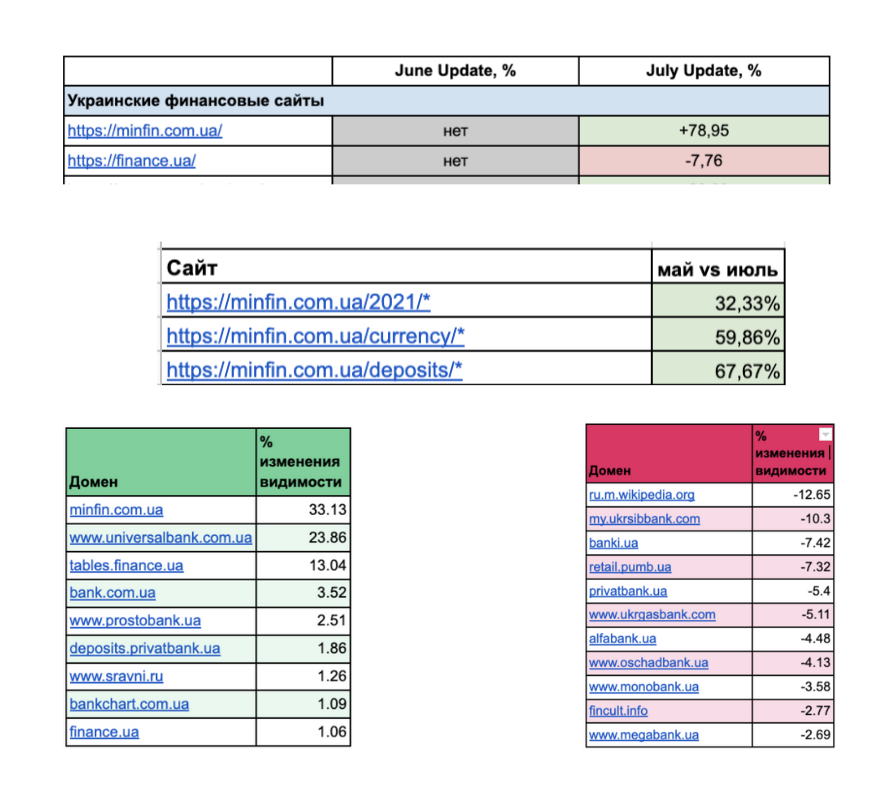 Minfin.com.ua и Finance.ua — это крупнейшие финансовые порталы в Украине. Финансовая ниша наряду с медицинской довольно излюблена Google. Он стал предъявлять к этой тематике особые требования и все апдейты проходят ощутимо. Плюс на порталах достаточно большой трафик и проседание видимости даже на 5% это значительно. Поэтому мы тщательно готовимся к апдейтам и уделяем достаточно времени постапдейтному анализу, чтобы в дальнейшем (если он прошел н очень хорошо) нивелировать негативные последствия.