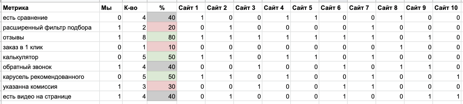 Должен быть продуктовый подход к анализу конкурентов в данной тематике. Помимо того, что вы смотрите ссылочные, текстовые факторы, вам нужно обращать внимание на особенности, которые есть у ваших конкурентов. С этим немного труднее, потому что их сложно отцифровать, автоматизировано спарсить, и тут понадобиться ручной труд SEO-специалиста, который знает, куда смотреть, может разложить сайт конкурента на какие-то элементы и понять, что из этого играет роль.