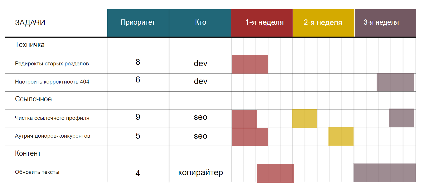 На реализацию плана может не всегда хватать ресурса. Поэтому чем лучше вы приоритизируете задачи, тем это будет эффективнее для сайта. Чтобы в выделенное время на SEO, например, команда разработки сделала то, что действительно для вас важно.